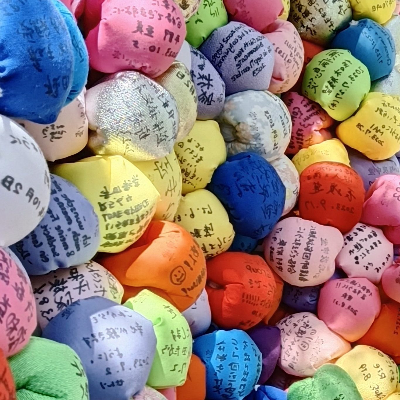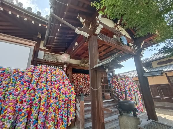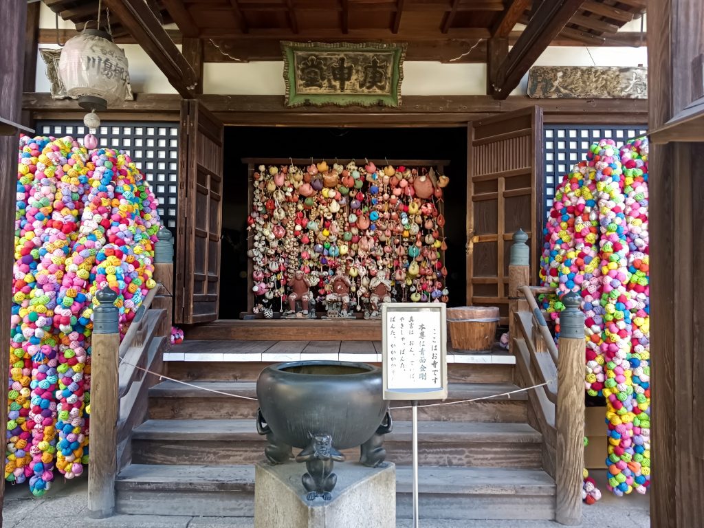 จุดที่แวะไปสักการะแห่งนี้ ชื่อ “ยาซากะ โคชินโด” (八坂庚申堂) หรืออีกชื่อหนึ่งคือ “วัดคงโก-จิ” (金剛寺) เป็นจุดขอพรที่สายมูไม่ควรพลาด เพราะที่นี่ไม่ใช่แค่บรรยากาศสุดจะ photogenic ถ่ายรูปแล้วสวยมากๆ แต่ยังมีความโดดเด่นที่เครื่องรางผ้าสีสันสดใส หน้าตาเหมือนลูกบอลทำจากผ้าสารพัดสี อันที่จริง ก้อนสีพวกนี้เป็นลิงที่กำลังทำท่าห้อยโหน—เท่าที่สังเกตดู เห็นคนญี่ปุ่นเค้าจะเขียนขอพรหรือเขียนคำอธิษฐานลงบนผ้า จากนั้นเอาลิงผ้าไปผูกห้อยต่อๆ กันเป็นเส้นยาวๆ ถ่ายรูปออกมาแล้วแปลกตามากๆ
