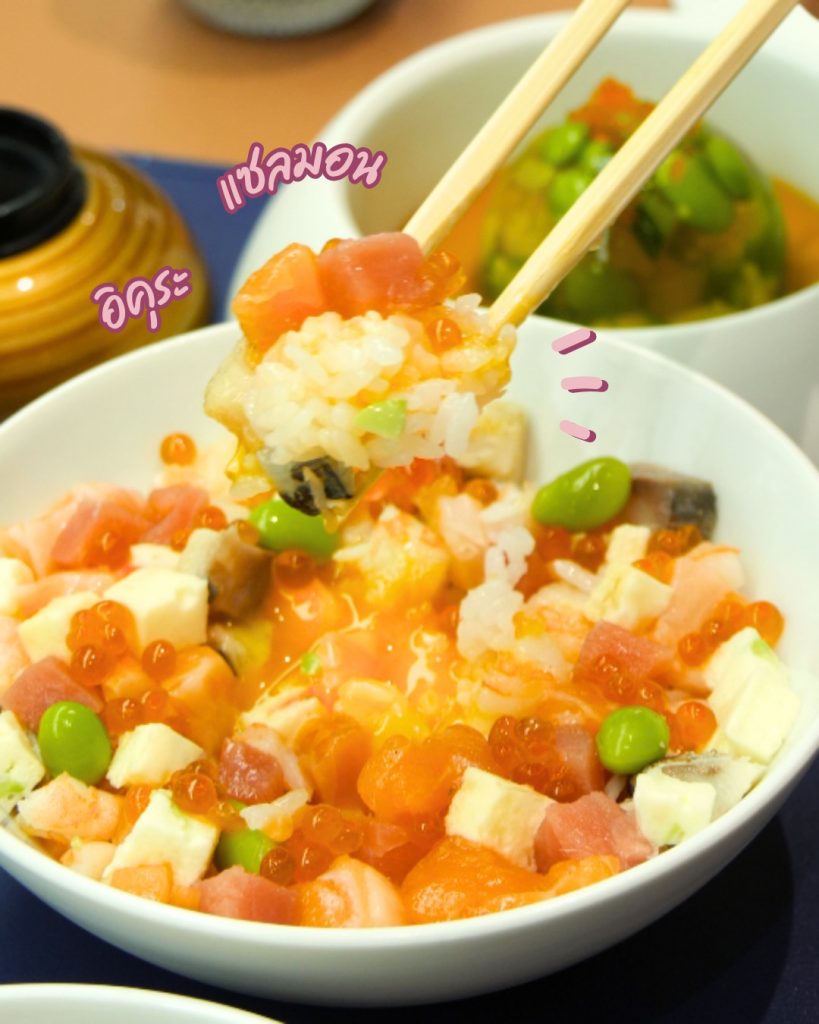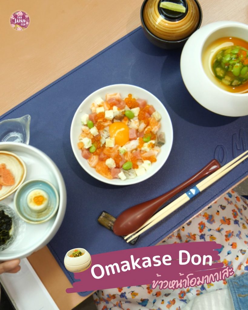 สำหรับคำว่า “Omakase” ในภาษาญี่ปุ่นมีความหมายว่า “แล้วแต่เชฟ” หรือ “ให้เชฟจัดให้” โดยเชฟจะเป็นผู้คัดสรรวัตถุดิบที่ดีที่สุด สดที่สุด ตามแต่ละฤดูกาล มาจัดเรียงบนข้าวสวยในชามเดียว แต่ละเมนูจึงขึ้นอยู่กับความคิดสร้างสรรค์และวัตถุดิบที่เชฟเตรียมไว้ในแต่ละวัน เช่น ไข่หอยเม่น (Uni), ไข่ปลาแซลมอน (Ikura), และหอยเชลล์ (Hotate) มาจัดเรียงอย่างสวยงาม
