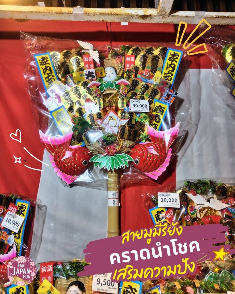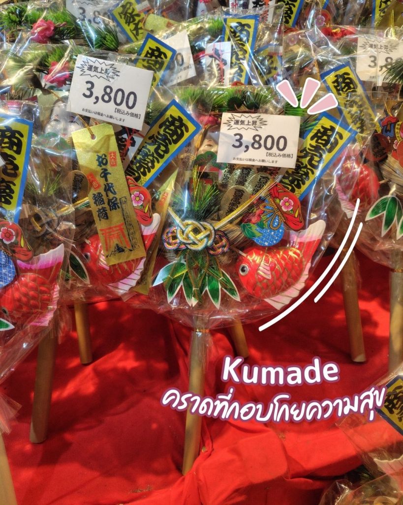 ระหว่างทางเดินไปศาลเจ้าโอโชโบะซัง จะพบกับร้านค้าที่ขาย “Kumade” หรือคราดนำโชคเรียงรายอยู่เต็มไปหมด แม้ว่า “คุมะเดะ” จะเป็นเครื่องรางที่รู้จักกันในวงกว้าง แต่จริง ๆ แล้วไม่ได้มีแค่คุมะเดะเพียงอย่างเดียว และยังมีลำดับการซื้อด้วยนะคะ บริษัทต่าง ๆ นิยมซื้อแล้วนำมาประดับที่บริษัท และซื้อขนาดใหญ่ขึ้นเรื่อย ๆ เพื่อกอบโกยความสุข ความเจริญรุ่งเรือง และความร่ำรวยเข้ามา